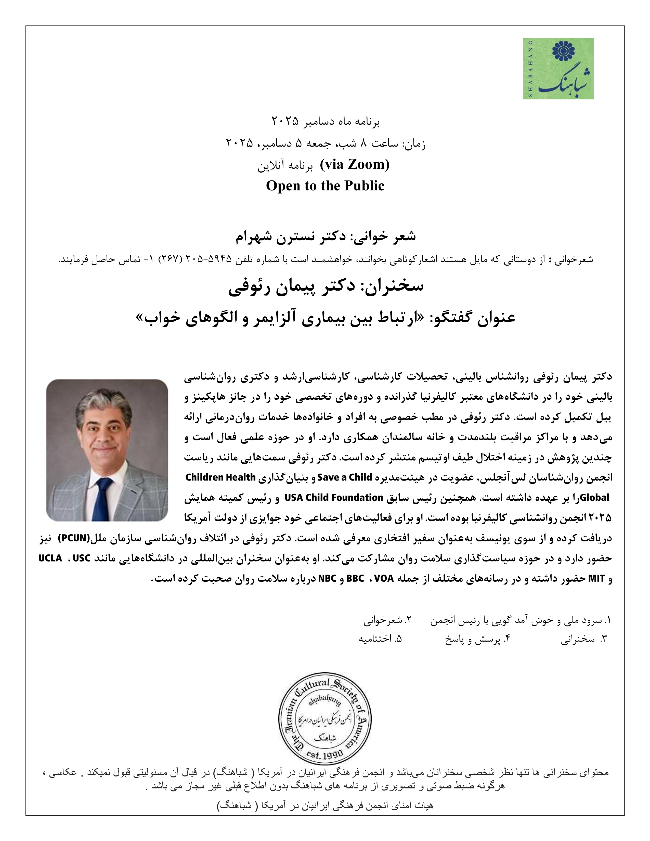 We have a friendly gathering on the first Friday of every month to express love to our people and culture. We will be more than happy to see you in the meeting and you will definitely enjoy Persian poem, lectures, and Iranian music plus delicious Noon-Panir-Chaei.